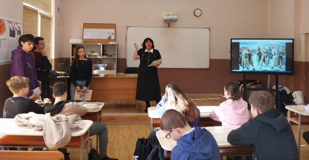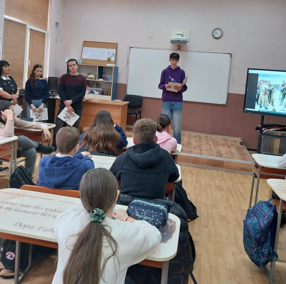 Днес се състоя един от първите уроци в рамките на инициативата между единствените участници от област Бургас – ОУ „Петко Р. Славейков“ и ПГРЕ „Г. С. Раковски“. Ученици от X и XII клас на Езиковата гимназия за романски езици, с ръководител г-жа Камелия Славейкова, гостуваха на шестокласниците от Славейковото училище с ръководител г-жа Иваничка Георгиева, за да представят един по-различен и емоционален прочит на образа и делото на Васил Левски – чрез силата на литературата.
