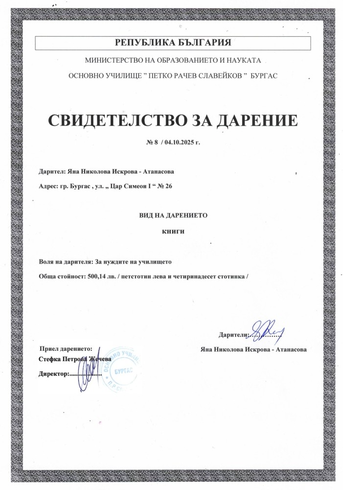 04.10.2025 г. ОУ „П. Р. Славейков“ Яна Атанасова Книги 500,14 лв